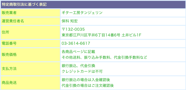 E-MAIL info@tangerine-guitars.com お手数ですがメールアドレスはコピー&ペーストでお願いします 東京都江戸川区平井6-14-6 土井ビル1F TEL/FAX 03-3614-6617 |