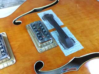 粘着材付きのサンドペーパーをボディの所定位置に貼付け、台座の下面をボディのアーチとぴったり合うように削ります。 |