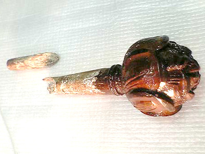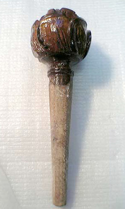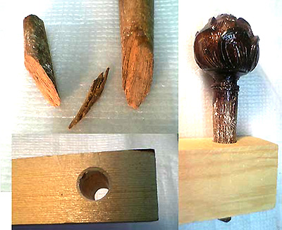 こんな修理の依頼がきました。 うっかり折ってしまったらしく、木工用ボンドでつけてみたけどダメ。 木工用ボンドでも上手くやればちゃんと付くんですけど、このような丸棒でテーパーがついてるのは圧着しづらいのでムズカシイですねー。 |