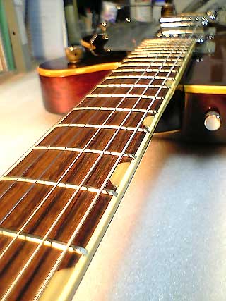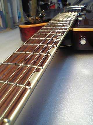 フレットも交換しました。 フレットを抜いた際に指板の狂いを削って修正してやります。 フレットエッジは1本ずつヤスリで面取りして、指への引っ掛かりが少なくなるように仕上げます。 |