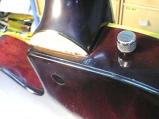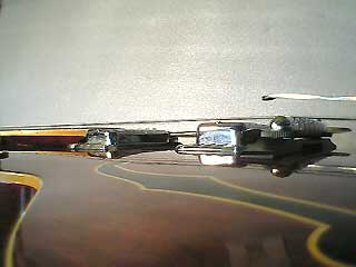 ネックはジョイント部分から元起きしているので、ブリッジでのテンションが弱く、弦の振動がトレモロの方へ逃げてしまっています。 強く弾くとブリッジ溝から弦が外れてしまいます。 |