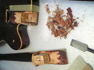 ネックとボディの隙間には薄いマホガニー材が挟まっているので、取り除きます。 なんだコレ!すげーいっぱい入ってるジャン! |