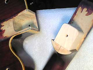 ネック側にメープル材を貼って、ボディ側のポケットとぴったり合うように削ります。 このあと接着します。 |