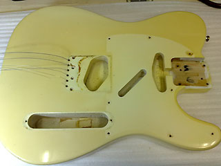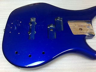 フェルナンデスのベース。 シールド処理前(上) 写真撮り忘れましたが、コントロール・キャビティ内にも同様の処理をしてます。 銅箔を貼り終えたらアース線を取り付けます。 |
