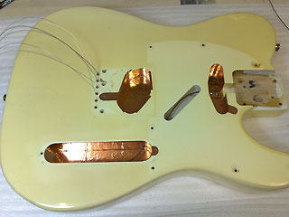 Fenderのストラトに代表されるシングルコイル・ピックアップはシャープで立ち上がりの良いサウンドが持ち味。 しかし空中をただよってる電磁波等のノイズを拾いやすいのが欠点です。 ピックアップや回路を金属で囲ってノイズから音声信号を守ってやるのが、良くある加工です。 このギターはボディのキャビティー内に銅箔テープを貼り込んでシールド加工した例です。 元々全くシールド処理がされていないギターだったので、効果は絶大でした。 |