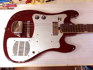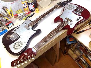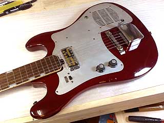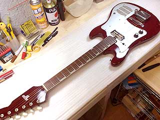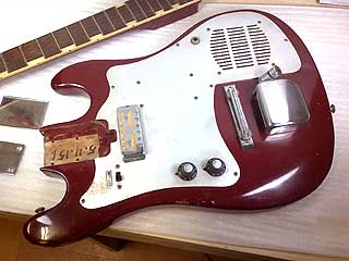 国産初のトランジスタ・アンプ内蔵ギター、テスコのTRG-1です! 症状はネックの逆反りがひどくて使えない&内蔵アンプが不調。 この状態で持ち込まれ、オーバーホールして使える状態にしてほしいとの事です。 |