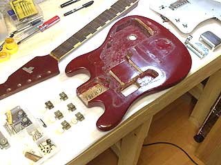 古いテスコのフレットは細い&低く、このように浮きもあるのでそのままではビビリが出て使えない物が多いです。 ネックの反りもひどいので、指板を削って修正します。 |