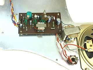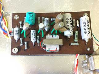 これが内蔵アンプの基盤です。トランジスタはゲルマニウム! TRG-1の修理は過去に数本やりましたが、ほとんどが電解コンデンサー不良です。 |