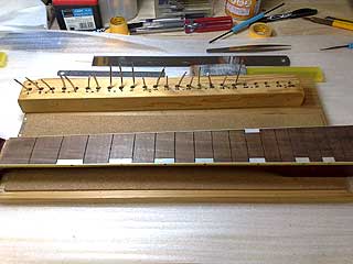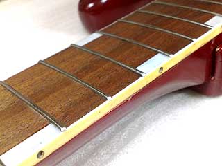 フレットを抜いて、指板を削って修正〜新しいフレットを打ちます。 フレットはすり合せの後、エッジの面取りを行ない、きれいに磨いて仕上げます。 |
