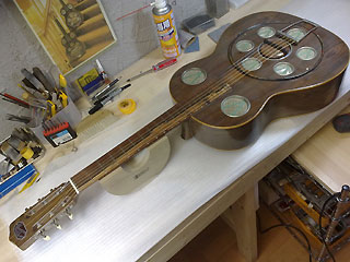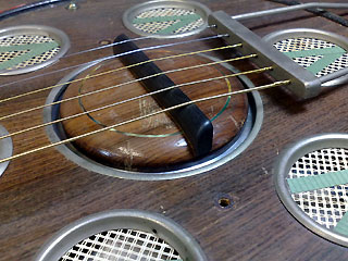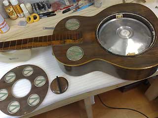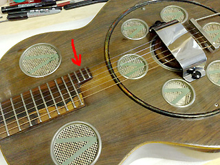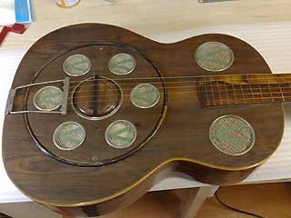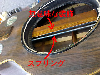 弦高を測った後、分解していきます。 リゾネーター・コーンを外してびっくり! 共鳴用の長いスプリングが4本入ってました! ネックからボディエンドまでつながっている補強材にはなぜか装飾が。。。(笑) |