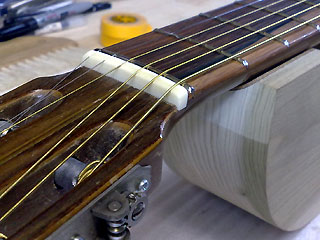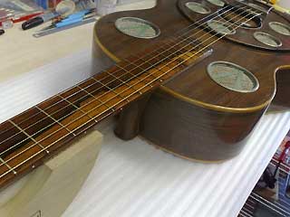 フレット交換完了〜! ナットもスチール弦に合わせて製作し、交換。 |