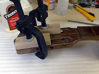 ヘッドのつき板が剥がれていたので、再接着しておきました。 |