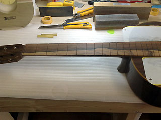 フレットを抜いて、指板を削って修正します。 このネックにはトラスロッドが入っていないので、弦を張った時の状態を想定し、あらかじめ少し逆反り気味に調整しておきます。 |