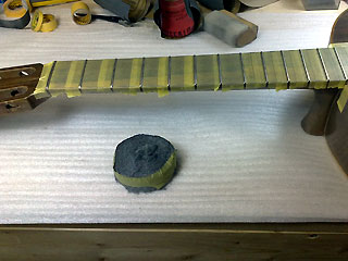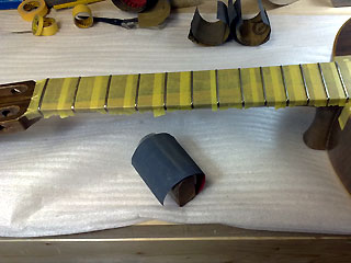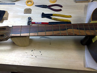フレットを打ち込み、両サイドに飛び出た余分をカット。 |