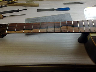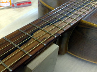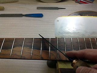 フレット端部を削り揃えた後、頂点のすり合わせを行ないフレット高さを揃えます。 そして専用のヤスリで頂点の形状を整えます。 |