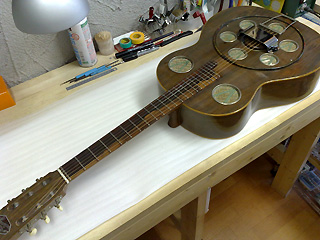 なかなか素敵なルックスですね! 指板もハカランダ。 でも狂いが出ていて、指板が波打ってますねー。 |