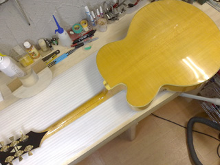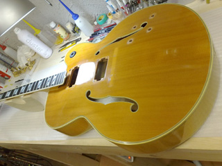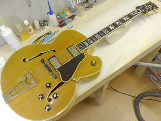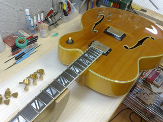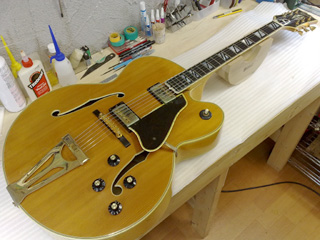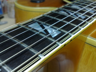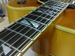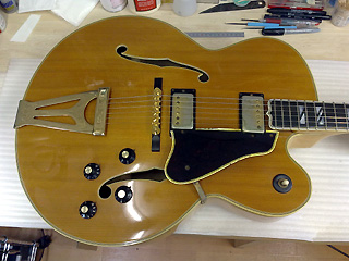 |    | ギブソンのフラッグシップ・モデルと言える高級フルアコ、スーパー400です! これは1970年代の物だそうですが、18インチ・ボディで圧倒的な存在感。 このギターはネックに狂いが出ている&フレットが低くて弾きづらいとの事で、フレット交換を中心としたリペアの依頼です。 こんなギターなかなかお目にかかれないので、いつもより多めに写真を撮ってみました。 |