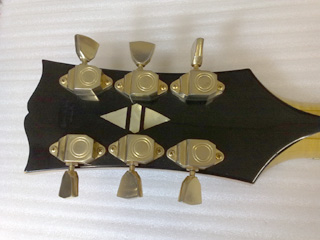 |   | 大きなボディとのバランスを考慮してなのか、ヘッドも大きいです。 ヘッド裏にもダイヤ形のインレイが入ってます。 ゴールドメッキのペグも重厚でゴージャスな感じ。 |