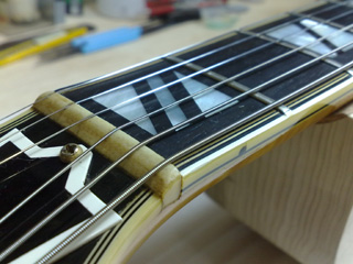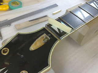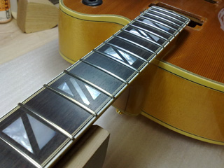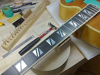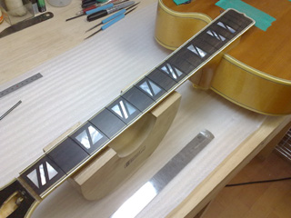 |    | フレットを抜き、指板面を削って狂いを修正。 新しいフレットを打ち、すり合せ&仕上げをします。 このあたりはいろいろ作業が多くて写真撮ってなかったですね。。。 |