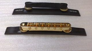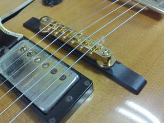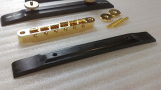 |     | ブリッジはチューン・オー・マチックに変えたいとの事です。 形状はできるだけオリジナルに近付けます。 これでブリッジが2セットになったので、音の好みによって付け替える事ができますね。 |