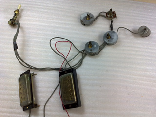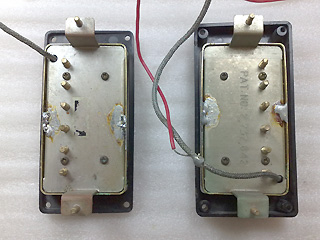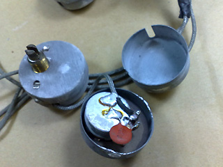 |    | 電気系もクリーニングします。 リアのTONEポットだけシールドカバーがなかったです。 各ポットはシールドカバーを開けて、内部を洗浄しました。 ピックアップはナンバードP.A.F。 |