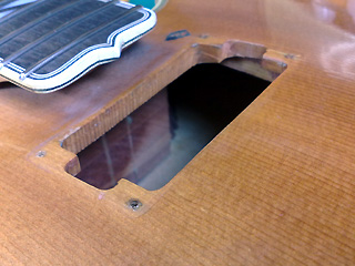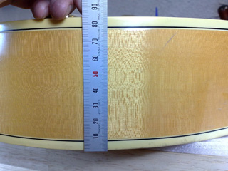 |   | ボディトップは高級品らしくスプルース材の単板削り出し。 ボディ厚さはサイド部分で85ミリ。 |