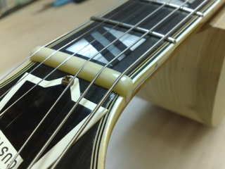 |   | フレットは消耗してるってのもありますが、低くてちょっと弾きにくいです。 オーナーの指定でジムダンロップ社の6105に打ち替えます。 フレットの高さが変わるので、それに合わせてナットも交換します。 |