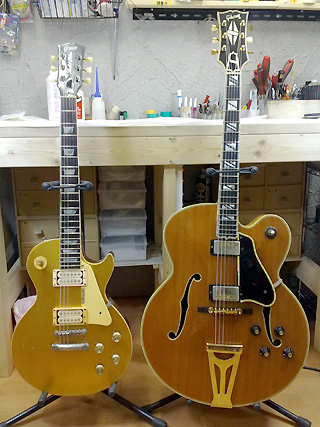 |    | 修理完了〜♪ レスポール(グレコだけど)と並べるとサイズの違いが良く分かりますね! |