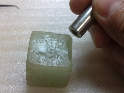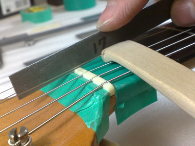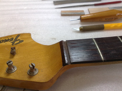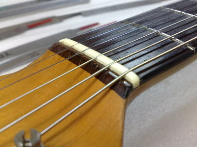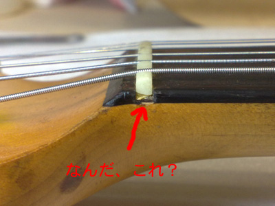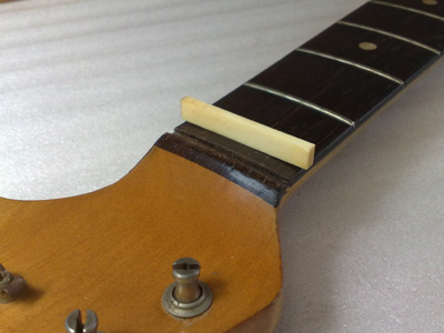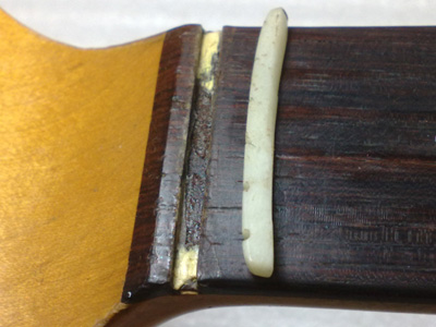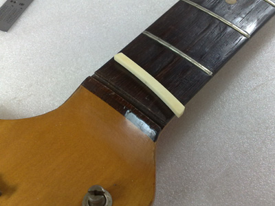 次にナットを調べると、ここにも何か挟まってますね。 取り外すと紙が入ってました。 ナット溝に残った接着剤を取り除いてきれいに整えます。 牛骨のブロックを削り出して接着。 接着後、上面を大まかに削り、弦溝を彫ります。 弦を張って微調整が済んだらナット上面を仕上げ、最後はコンパウンドで磨いて完了〜。 |