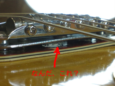 ちょっと弾いてみるとビビるのは特定のポジションではなく、全体的にビビります。 ブリッジをよく見ると、ミュート機構とボディの間に何か挟まっています。 ブリッジとミュートを外すとガムテープを折り畳んだ物が挟まってました。 ミュートは使わないとの事なので取り外しました。 |