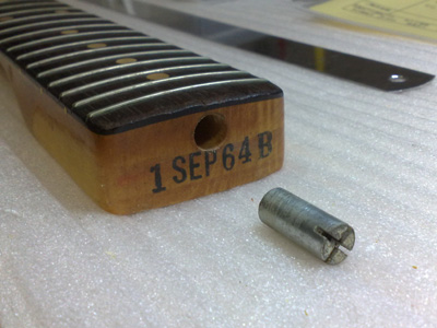 ネック・エンドには日付けのスタンプが。 トラスロッド・ナットは一旦取り外して磨きあげ、 ネジ部にロウを塗っておきます。 この一手間で調整がしやすくなります。 |