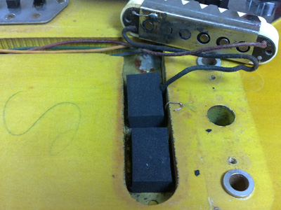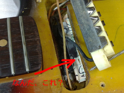 ピックアップを外すと、高さ調整用のスポンジゴムが完全に固まっており、炭のように変質してました。 フロント側は。。。 ん? 何か入ってるぞ! |