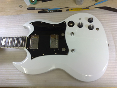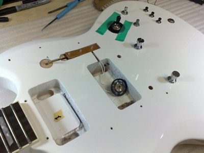 ギター側のコントロールは1V、1Tにして、空いたスペースにギミック用のスイッチを取り付けました。
