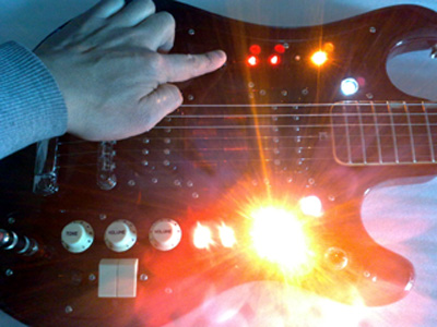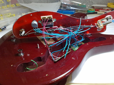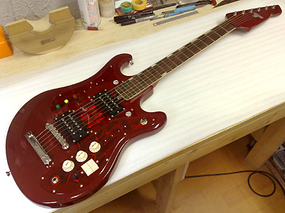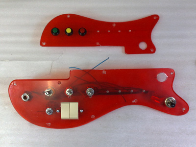 シースルーにしたのは、LEDによってピックガード全体に光が広がるかもしれないし、内部配線が見えるのも面白いと思ったので。