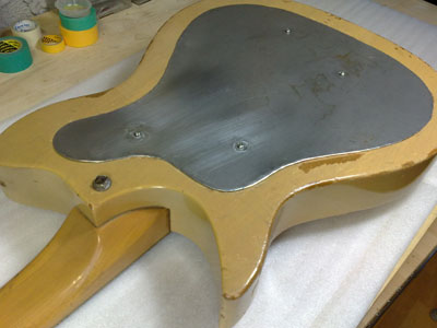 ボディの汚れを軽く落とし、リプロ品のピックガードとブリッジカバーを取り付けました。 ボリュームのノブもオーナー様がアメリカから手配中。 |