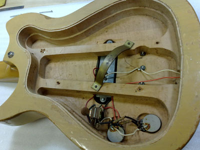裏蓋を開けるとこんな感じ。 ボディ内は大きくくり抜かれていて、セミホロウになってます。 でもボディ自体の厚みがかなりあるので、ずっしり重いギターです。 |