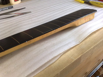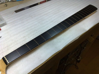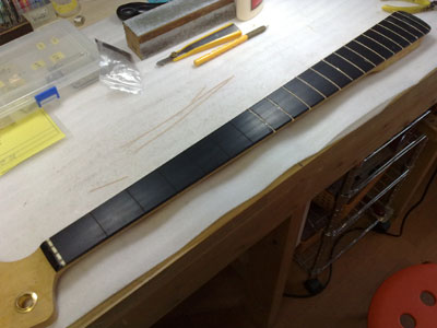 SCHECTERのフレットレス・ベース、指板にライン入れ中。 最初に写真を撮っていませんでしたが、フレットラインをノコギリで溝切りし、メープルの薄板を埋め込んでいきます。 |