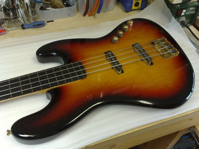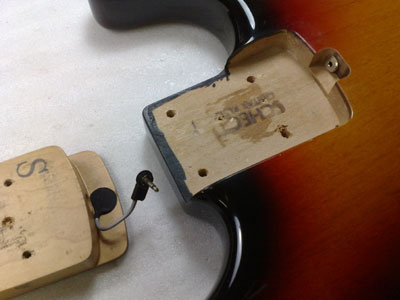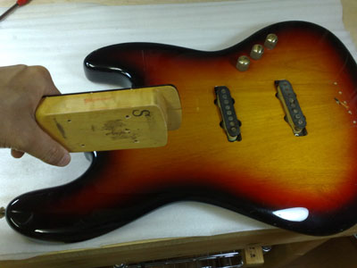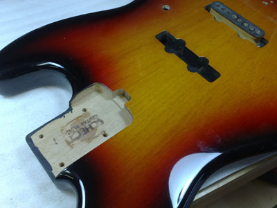 オーナー様は弦が指板に当たる音(スラップ音)も強調したいとの事で、何かいい方法がないかとの御相談でした。 見たところ指番エンドが延長されたネックでしたので、ここにピエゾ・ピックアップを貼付けたらどうでしょう、と御提案させて頂きました。 ボディのコントロール・キャビティーにはボリュームが1つ入るスペースもあり、ピエゾ用のボリュームを追加するのに好都合です。 |