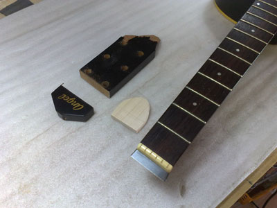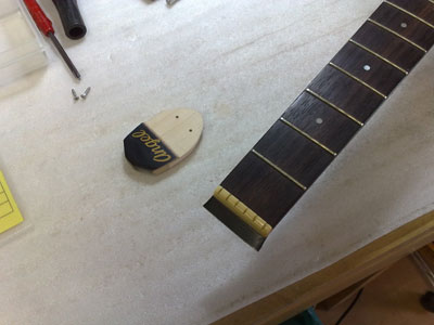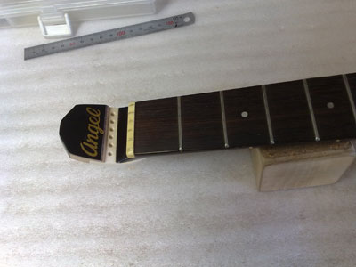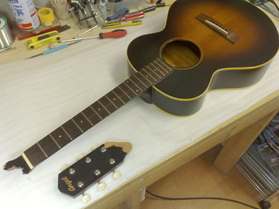 Angelのミニ・アコースティックギター。 しかしポッキリとやってしまいました。 ネックは細く薄く、さらにヘッド付け根部分はトラスロッドのアンカーもあり、強度は無さそうです。 単純に接着だけでは無理そうな感じですね、、、困った。 |