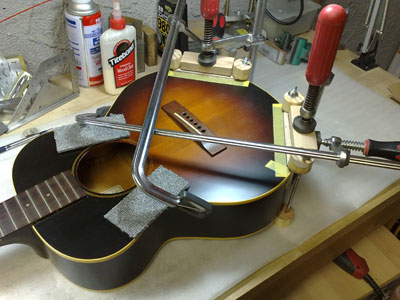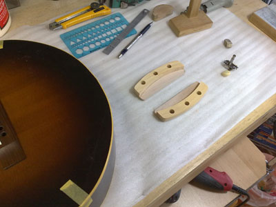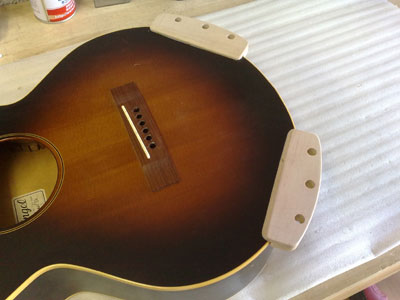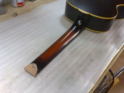 はい!ヘッドレス・アコースティックギターのできあがり! 依頼主は友人のブルースマンで、いろいろ話しているうちに「いっそのこと、ヘッドレスにしちゃうのはどうよ?」と持ちかけられました。 音も特に問題なし。ただ、これだと右肘に当たるペグが邪魔でしたね。。。 |