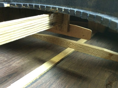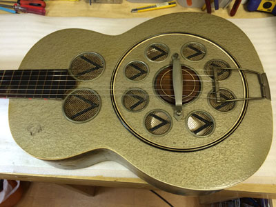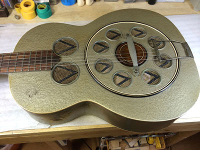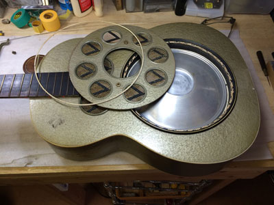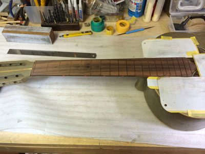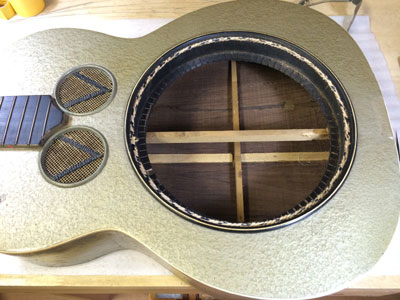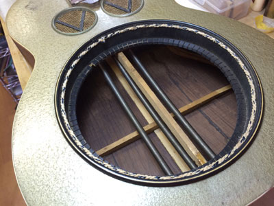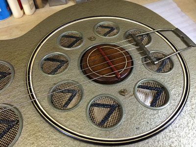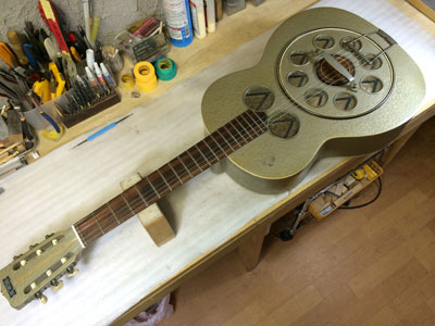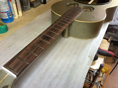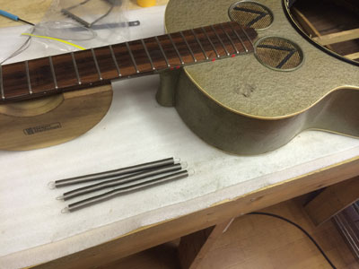 フレット、ナットを交換します。 あ、このモデルは内部に共鳴用スプリングは付いてないんですね。 |