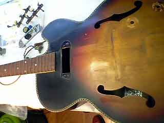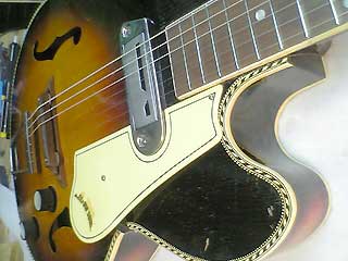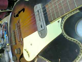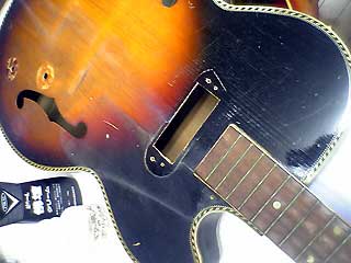 小振りで軽い1960年代の国産フルアコです。 汚い、アンプにつないでも音が出ない、弦高下げるとビビリまくり(涙) このままではとても使える状態ではないので徹底的にオーバーホールします。 上の写真がオーバーホール前。 下の写真がオーバーホール後。 |