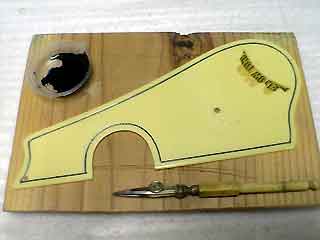 ピックガードの縁取りがほとんど消えてしまっていたので、カラス口で色入れしました。 |